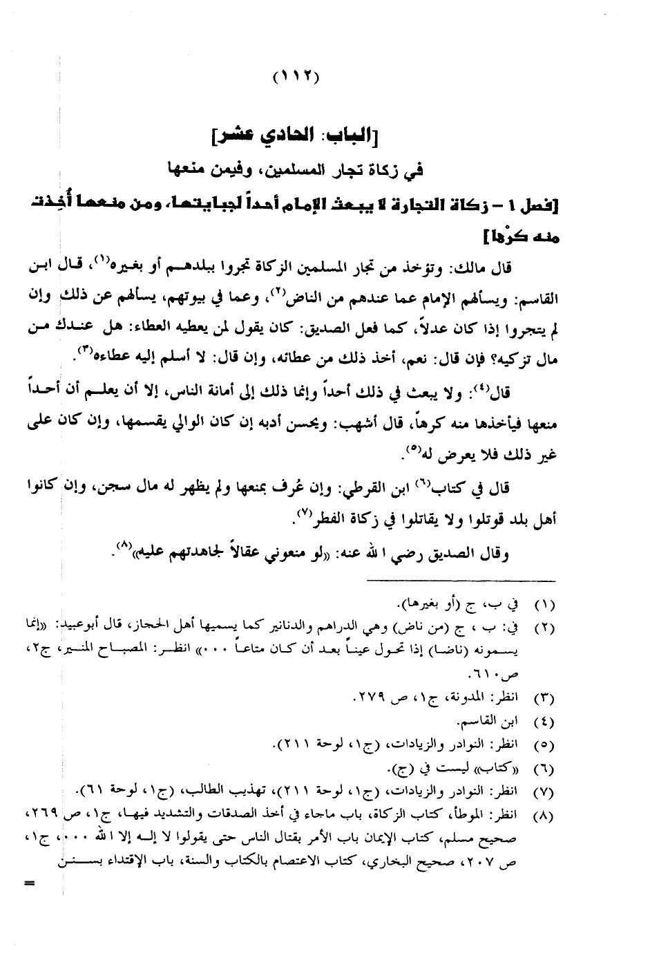 قال مالك: وتؤخذ من تجار المسلمين الزكاة تجروا ببلدهم أو بغيره، قال ابن القاسم: ويسألهم الإمام عما عندهم من الناض، وعما في بيوتهم، يسألهم عن ذلك وإن لم يتجروا إذا كان عدلا، كما فعل الصديق: كان يقول لمن يعطيه العطاء: هل عندك من مال تزكيه؟ فإن قال: نعم، أخذ ذلك من عطائه، وإن قال: لا أسلم إليه عطاءه.
