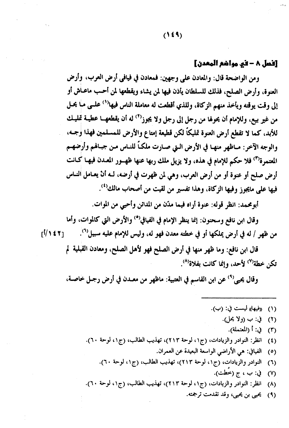 ومن الواضحة قال: والمعادن على وجهين: فمعادن في فيافى أرض العرب، وأرض العنوه، وأرض الصلح، فذلك للسلطان يأذن فيها لمن يشاء ويقطعها لمن أحب ما عاش أو إلى وقت بوقته ويأخذ منها الزكاة، وللذي أقطعت له معاملة الناس فيها على ما يحل من غير بيع، وللإمام أن يحولها من رجل إلى رجل ولا يجوز له أن يقطعها عطية تمليك للأبد، كما لا تقطع أرض العنوه تمليكاً لكن قطيعة إمتاع والأرض للمسلمين فهذا وجه، والوجه الآخر: ما ظهر منها في الأرض التي صارت ملكا للناس من جبالهم وأرضهم المعتمرة فلا حكم للإمام في هذه، ولا يزيل ملك ربها عنها ظهور المعدن فيها كانت أرض صلح أو عنوة أو من أرض العرب، وهي لمن ظهرت في أرضه، له أن يعامل الناس فيها على ما يجوز وفيها الزكاة، وهذا تفسير من لقيت من أصحاب مالك.