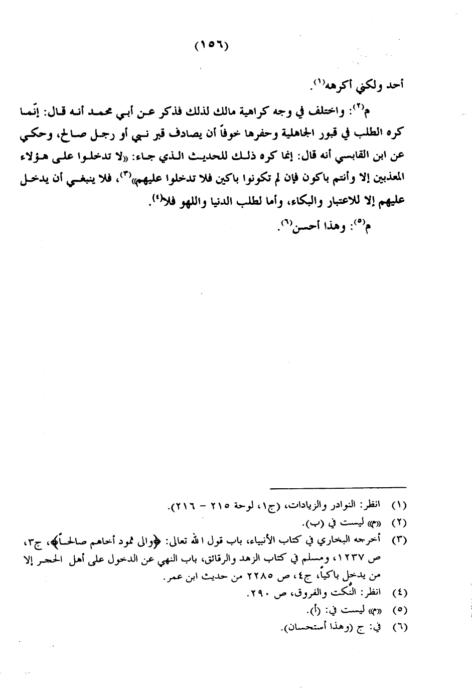 م: واختلف في وجه كراهية مالك لذلك فذكر عن أبي محمد انه قال: إنما كره الطلب في القبور الجاهلية وحفرها خوفاً أن يصادف قبر نبي أو رجل صالح، وحكي عن أبي القابسي أنه قال: إنما كره ذلك الحديث الذي جاء: ((لا تدخلوا على هؤلاء المعذبين إلا وأنتم باكون فان لم تكونوا باكين فلا تدخلوا عليهم))، فلا ينبغي أن يدخل عليهم إلا للاعتبار والبكاء، وأما لطلب الدنيا واللهو فلا.
