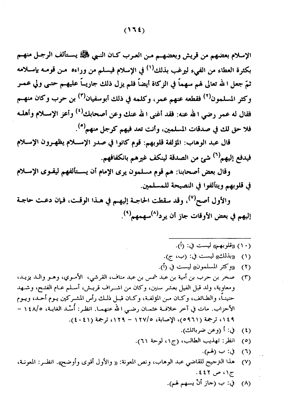 قال عبد الوهاب: المؤلفة قلوبهم: قوم كانوا في صدر الإسلام يظهرون فيدفع إليهم شيء من الصدقة لينكف غيرهم بإنكفافهم.