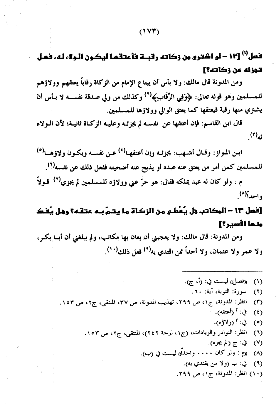 ومن المدونة قال مالك: ولا بأس أن يبتاع الإمام من الزكاة رقاباً يعتقهم وولاؤهم للمسلمين وهو قوله تعالى: {وَفِي الرِّقَابِ} وكذلك من ولى صدقة نفسه لا بأس أن يشتري منها رقبة فيعتقها كما يعتق الوالي وولاؤها للمسلمين.