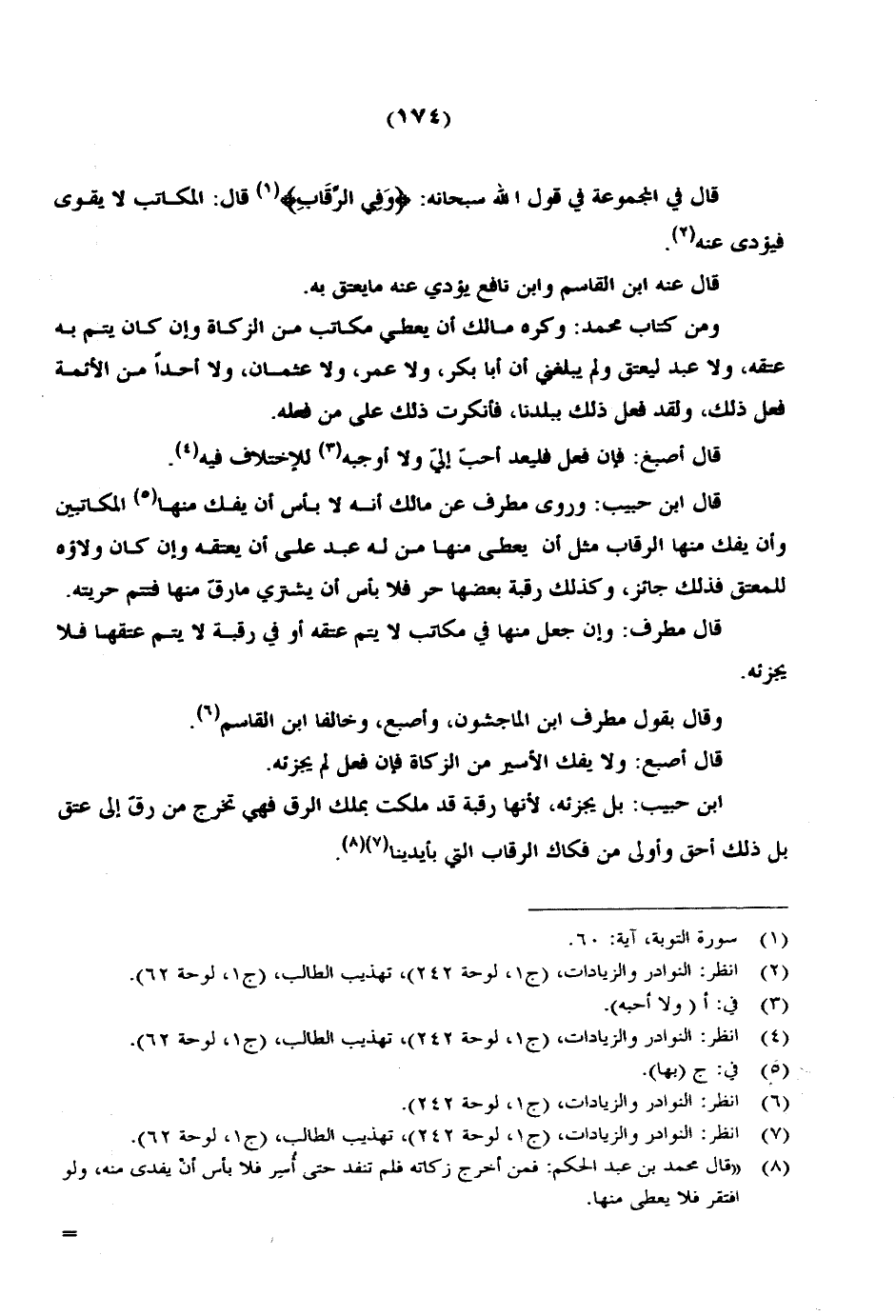 قال في المجموعة في قوله سبحانه: {وَفِي الرِّقَابِ} قال: المكاتب لا يقوى فيؤدي عنه.
