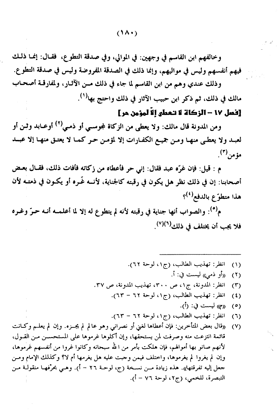 ومن المدونة قال مالك: ولا يعطى من الزكاة لمجوسي أو ذمي أو عابد وثن أو لعبد ولا يعطى منها ومن جميع الكفارات إلا لمؤمن حر كما لا يعتق منها إلا عبد مؤمن.