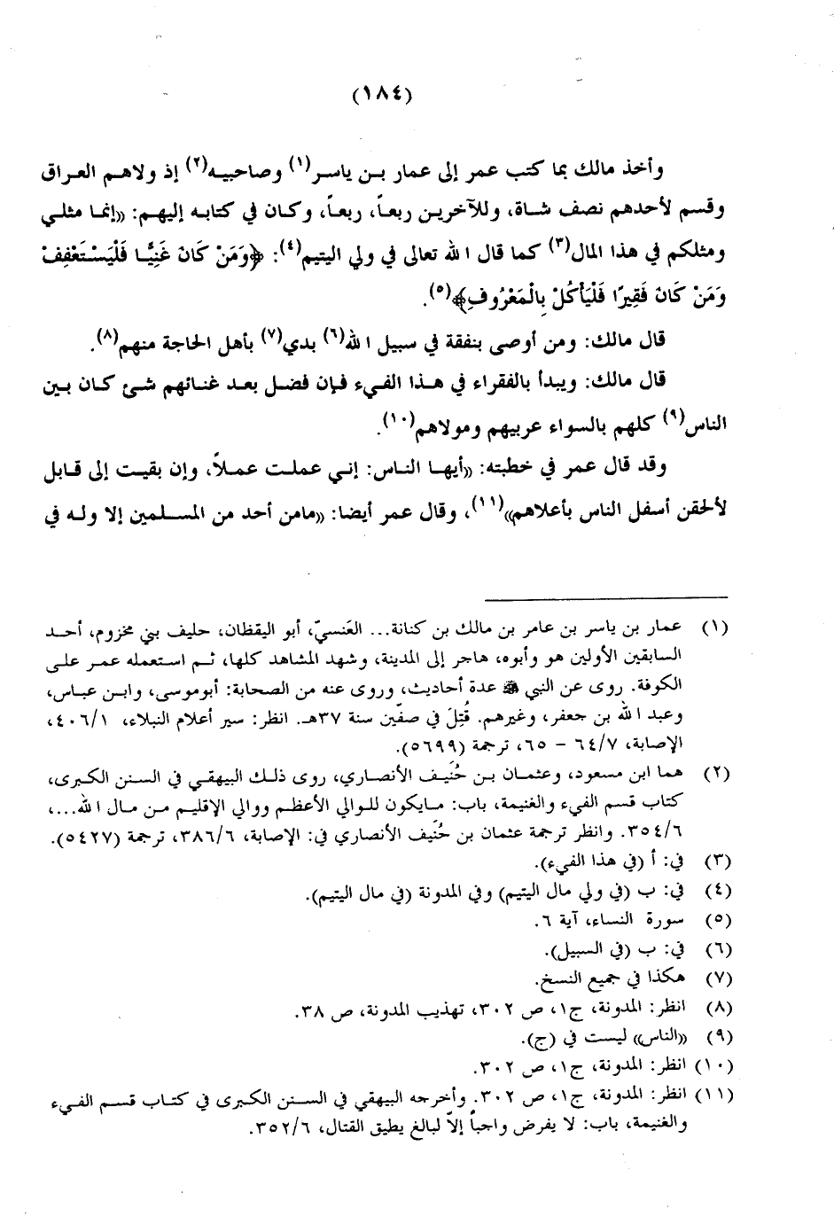 وأخذ مالك بما كتب عمر الى عمار بن ياسر وصاحبيه إذ ولاهم العراق وقسم لأحدهم نصف شاة، وللآخرين ربعاً، ربعاً، وكان في كتابه اليهم: "إنما مثلي ومثلكم في هذا المال كما قال الله تعالى في ولي اليتيم: {وَمَن كَانَ غَنِيًّا فَلْيَسْتَعْفِفْ وَمَن كَانَ فَقِيرًا فَلْيَاكُلْ بِالْمَعْرُوفِ}