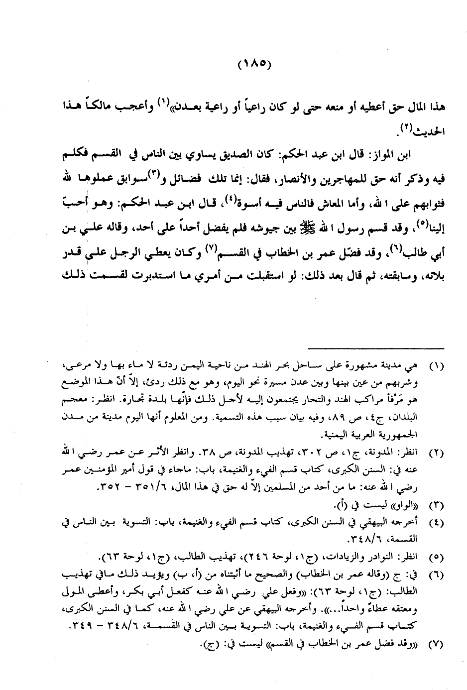 ابن المواز: قال ابن عبد الحكيم: كان الصديق يساوي بين الناس في القسم فكلم فيه وذكر أنه حق للمهاجرين والأنصار، فقال: إنما تلك فضائل وسوابق عملوها لله فثوابهم على الله، وأما المعاش فالناس فيه أسوة، قال ابن عبد الحكيم: وهو أحب الينا، وقد قسم رسول الله صلى الله عليه وسلم بين جيوشه فلم يفضل أحداً على أحد، وقاله على بن أبي طالب، وقد فضل عمر بن الخطاب في القسم وكان بعطي الرجل على قدر بلائه، وسابقته، ثم قال بعد ذلك: لو استقبلت من أمري ما استدبرت لقسمت ذلك
