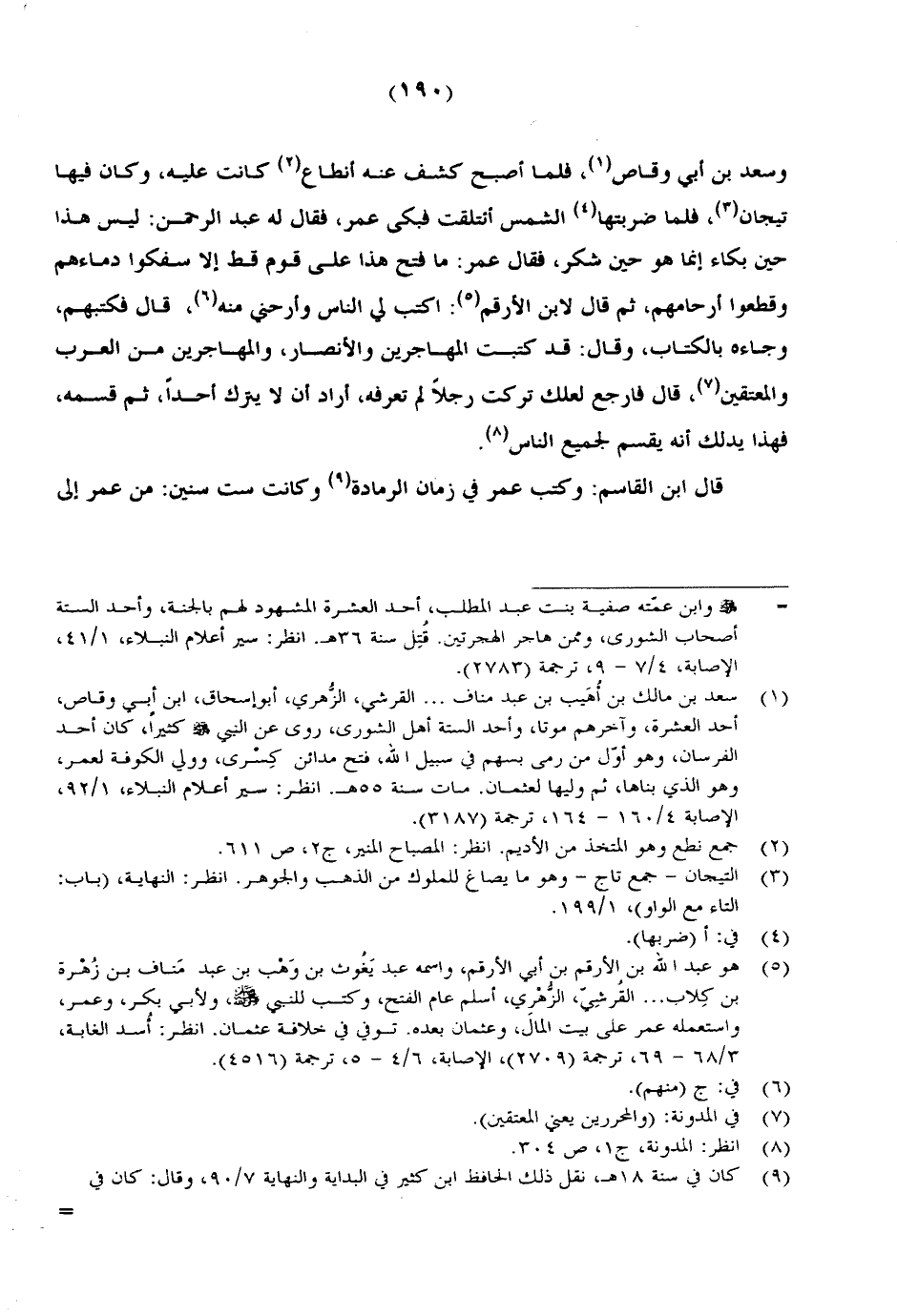 وسعد بن أبي وقاص، فلما أصبح كشف عنه أنطاع كانت عليه، وكان فيها تيجان، فلما ضربتها الشمس انتقلت فبكى عمر، فقال له عبد الرحمن: ليس هذا حين بكاء إنما هو حين شكر، فقال عمر: ما فتح هذا على قوم قط إلا سفكوا دماءهم وقطعوا أرحامهم، ثم قال لابن الأرقم: اكتب لي الناس وأرحني منه، قال فكتبهم، وجاءه بالكتاب، وقال: قد كتبت المهاجرين والأنصار، والمهاجرين من العرب والمعتقين، قال فارجع لعلك تركت رجلاً لم تعرفه، أراد أن لا يترك أحداً، ثم قسمه، فهذا يدلك أنه يقسم لجميع الناس.