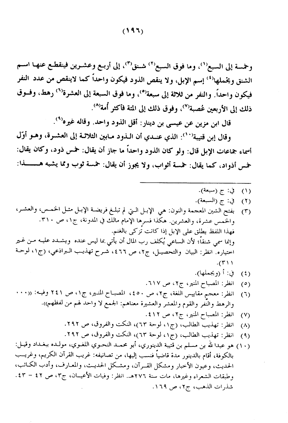 وخمسة إلى السبع، وما فوق السبع شنق، إلى أربع وعشرين فينقطع عنها اسم الشنق ويحملها اسم الإبل، ولا ينقص الذود فيكون واحداً كما لا ينقص من عدد النفر فيكون واحداً. والنفر من ثلاثة إلى سبعة، وما فوق السبعة إلى العشرة رهط، وفوق ذلك إلى الأربعين عصبة، وفوق ذلك إلى المئة فأكثر أمة.
