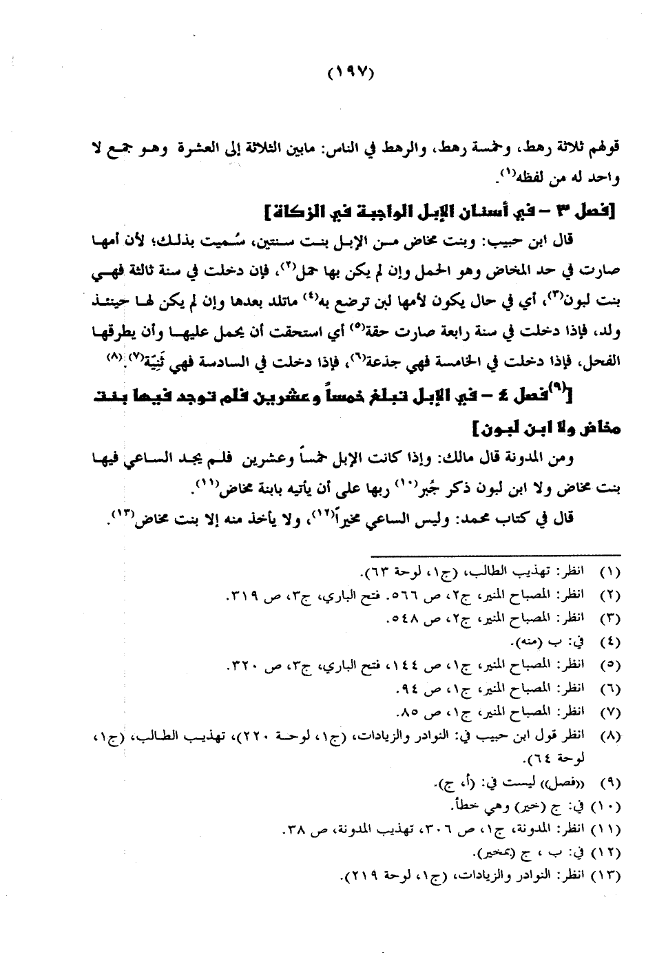 قال ابن حبيب: وبنت مخاض من الإبل بنت سنتين، سميت بذلك؛ لأن أمها صارت في حد المخاض وهو الحمل وإن لم يكن بها حمل، فإن دخلت في سنة ثالثة فهي بنت لبون، أي في حال يكون لأمها لبن ترضع به ما تلد بعدها وإن لم يكن لها حينئذ ولد، فإذا دخلت في سنة رابعة صارت حقة أي استحقت أن يحمل عليها وأن يطرقها الفحل، فإذا دخلت في الخامسة فهي جذعة، فإذا دخلت في السادسة فهي ثنية.
