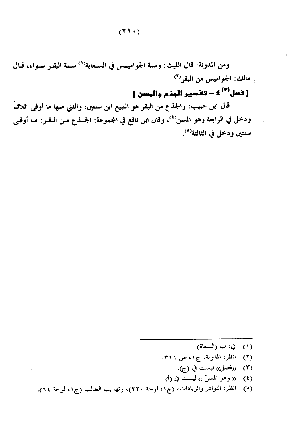 قال ابن حبيب: والجذع من البقر هو التبيع ابن سنتين، والثني منها ما أوفى ثلاثاً ودخل في الرابعة وهو المسن، وقال ابن نافع في المجموعة: الجذع من البقر: ما أوفى سنتين ودخل في الثالثة.