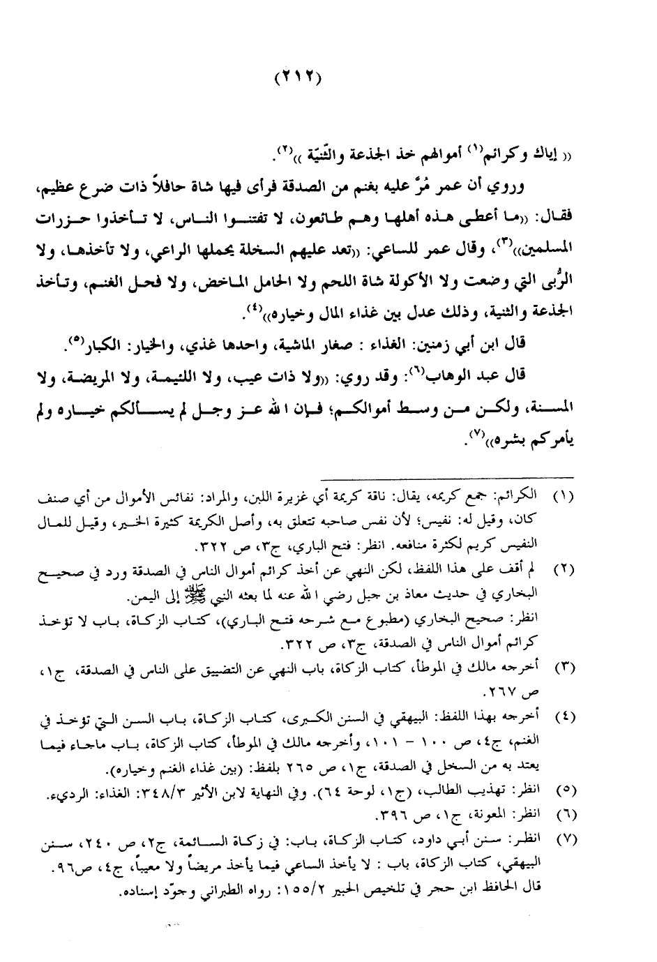 وروي أن عمر مُرَّ عليه بغنم من الصدقة فرأى فيها شاة حافلاً ذات ضرع عظيم، فقال: "ما أعطى هذه أهلها وهم طائعون، لا تفتتنوا الناس، لا تأخذوا حزرات المسلمين"، وقال عمر للساعي: "تعد عليهم السخلة يحملها الراعي، ولا تأخذها، ولا الرُّبى التي وضعت ولا الأكولة شاة اللحم ولا الحامل الماخض، ولا فحل الغنم، وتأخذ الجذعة والثنية، وذلك عدل بين غذاء المال وخياره".