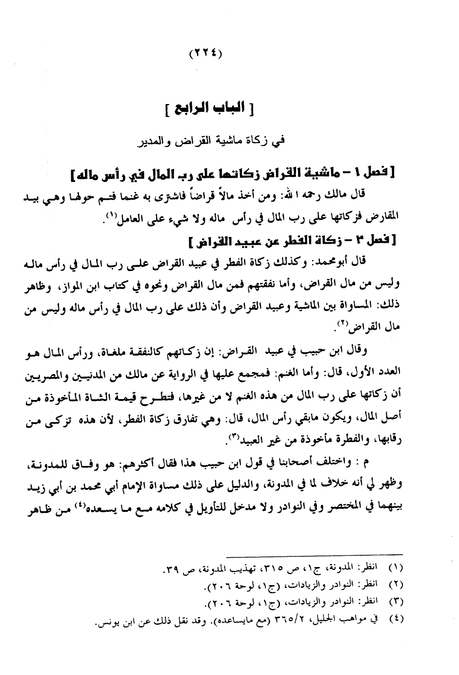وقال ابن حبيب في عبيد القراض: إن زكاتهم كالنفقة ملغاة، ورأس المال هو العدد الأول، قال: وأما الغنم: فمجمع عليها في الرواية عن مالك من المدنيين والمصريين أن زكاتها على رب المال من هذه الغنم لا من غيرها، فتطرح قيمة الشاة المأخوذة من أصل المال، ويكون ما بقي رأس المال، قال: وهي تفارق زكاة الفطر، لأن هذه تزكى من رقابها، والفطرة مأخوذة من غير العبيد.