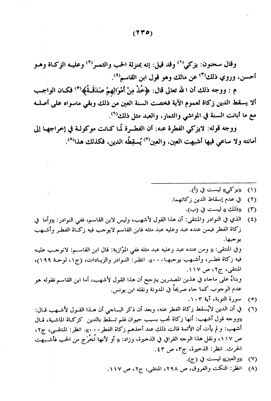 م: ووجه ذلك أن الله تعالى قال: {خُذْ مِنْ أَمْوَالِهِمْ صَدَقَةً} فكان الواجب ألا يسقط الدين زكاة لعموم الآية فخصت السنة العين من ذلك وبقي ما سواه على أصله مع ما أبانت السنة في المواشي والثمار، والعبد مثل ذلك.