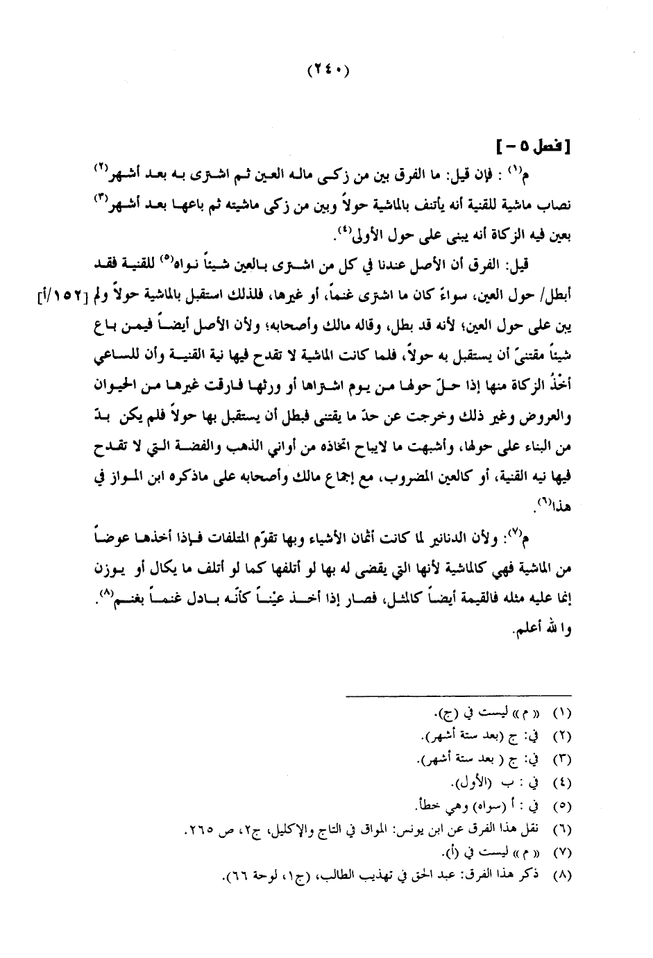 قيل: الفرق أن الأصل عندنا في كل من اشترى بالعين شيئاً نواه للقنية فقد أبطل/ حول العين، سواء كان ما اشترى غنماً، أو غيرها، فلذلك استقبل بالماشية حولاً ولم يبن على حول العين؛ لأنه قد بطل، وقاله مالك وأصحابه؛ ولأن الأصل أيضاً فيمن باع شيئاً مقتنى أن يستقبل به حولاً، فلما كانت الماشية لا تقدح فيها نية القنية وأن للساعي أخذ الزكاة منها إذا حل حولها من يوم اشتراها أو ورثها فارقت غيرها من الحيوان والعروض وغير ذلك وخرجت عن حد ما يقتنى فبطل أن يستقبل بها حولاً فلم يكن بد من البناء على حولها، وأشبهت ما لا يباح اتخاذه من أواني الذهب والفضة التي لا تقدح فيها نية القنية، أو كالعين المضروب، مع إجماع مالك وأصحابه على ما ذكره ابن المواز في هذا.
