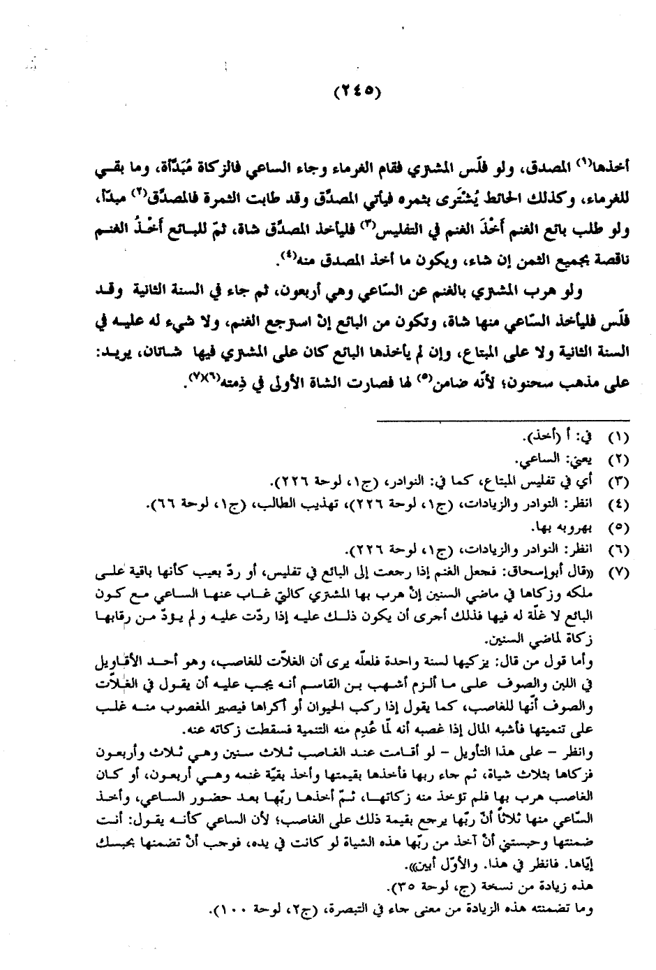 ولو هرب المشتري بالغنم عن السّاعي وهي أربعون، ثم جاء في السنة الثانية وقد فلس فليأخذ الساعي منها شاة، وتكون من البائع إن استرجع الغنم، ولا شئ له عليه في السنة الثانية ولا على المبتاع، وإن لم يأخذها البائع كان على المشتري فيها شاتان، يريد: على مذهب سحنون؛ لأنه ضامن لها فصارت الشاة الأولى في ذِمته.