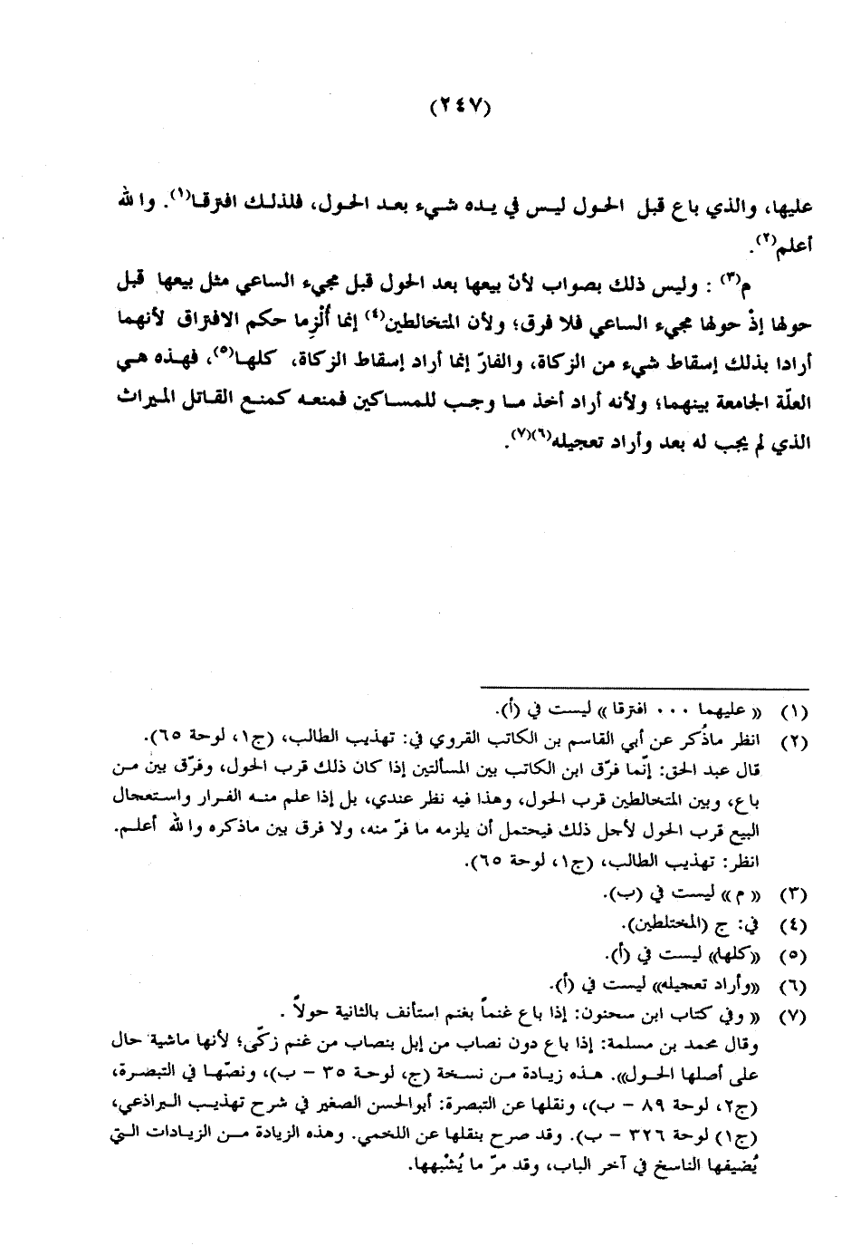 م: وليس ذلك بصواب لأن بيعها بعد الحول قبل مجئ الساعي مثل بيعها قبل حولها إذْ حولها مجئ الساعي فلا فرق؛ ولأن المتخالطين إنما ألزما حكم الافتراق لأنهما أرادا بذلك إسقاط شئ من الزكاة، والفارّ إنما أراد إسقاط الزكاة، كلها، فهذه هي العلة الجامعة بينهما؛ ولأنه أراد أخذ ما وجب للمساكين فمنعه كمنع القاتل الميراث الذي لم يجب له بعد وأراد تعجيله.