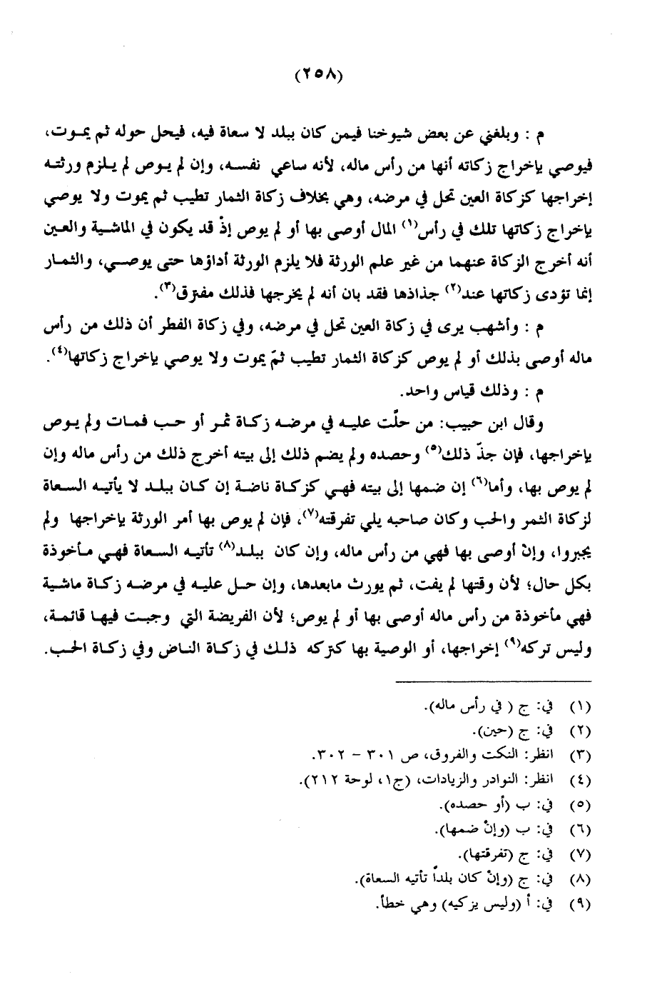 وقال ابن حبيب: من حلت عليه في مرضه زكاة ثمر أو حب فمات ولم يوص بإخراجهما، فإن جذ ذلك وحصده ولم يضم ذلك إلى بيته أخرج ذلك من رأس ماله وإن لم يوص بها، وأما إن ضمها إلى بيته فهي كزكاة ناضة إن كان ببلد لا ياتيه السعاة لزكاة الثمر والحب وكان صاحبه يلي تفرقته، فإن لم يوص بها أمر الورثة بإخراجها ولم يجبروا، وإن أوصى بها فهي من رأس ماله، وإن كان ببلد تأتيه السعاة فهي مأخوذة بكل حال؛ لأن وقتها لم يفت، ثم يورث ما بعدها، وإن حل عليه في مرضه زكاة ماشية فهي مأخوذة من رأس ماله أوصي بها أو لم يوص؛ لأن الفريضة التي وجبت فيها قائمة، وليس تركه إخراجها، أو الوصية بها كتركة ذلك في زكاة الناض وفي زكاة الحب.