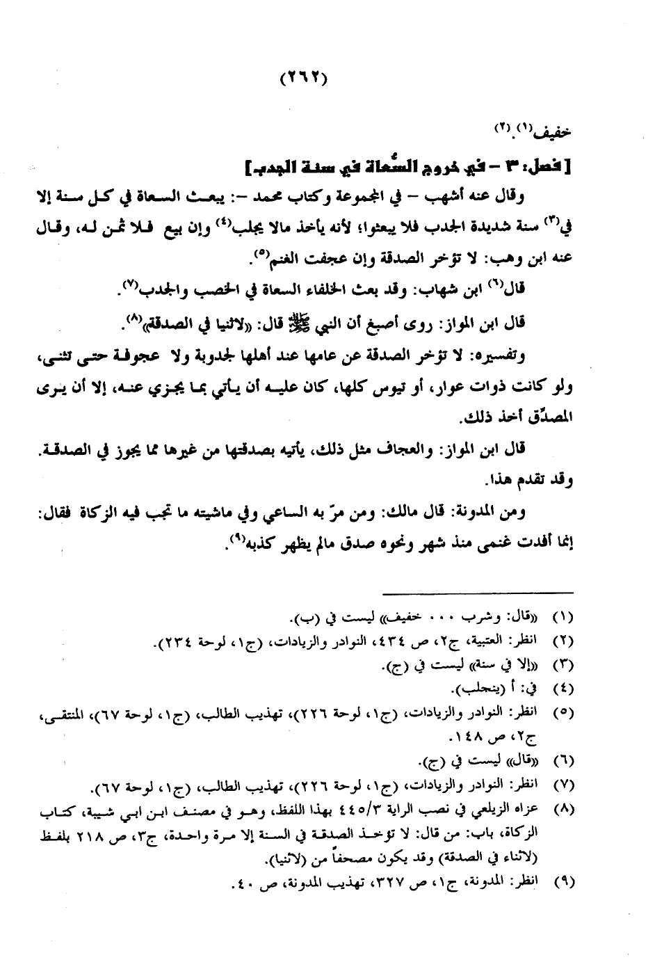 وقال عنه أشهب- في المجموعة وكتاب محمد-: يبعث السعاة في كل سنة إلا في سنة شديدة الجدب فلا يبعثوا؛ لأنه يأخذ مالا يجلب وإن بيع فلا ثمن له، وقال عنه ابن وهب: لا تؤخر الصدقة وإن عجفت الغنم.