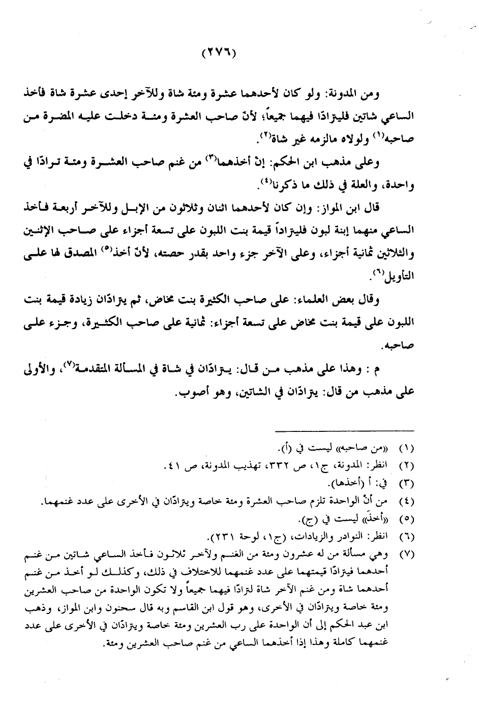 ومن المدونة: ولو كان لأحدهما عشرة ومئة شاة وللآخر إحدى عشرة شاة فأخذ الساعي شاتين فيترادا فيهما جميعًا؛ لأن صاحب العشرة ومئة دخلت عليه المضرة من صاحبه ولولاه ما لزمه غير شاة.