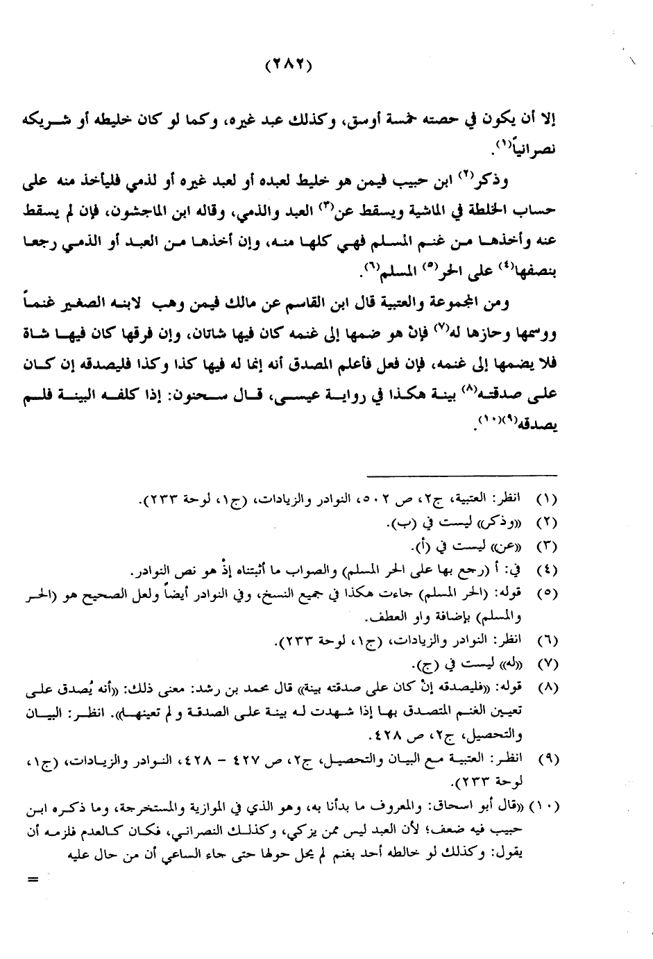وذكر ابن حبيب فيمن هو خليط لعبده أو لعبد غيره أو لذمي فليأخذ منه على حساب الخلطة في الماشية ويسقط عن العبد والذمي، وقاله ابن الماجشون، فإن لم يسقط عنه وأخذها من غنم المسلم فهى كلها منه، وإن أخذها من العبد أو الذمي رجعا بنصفها على الحر المسلم.