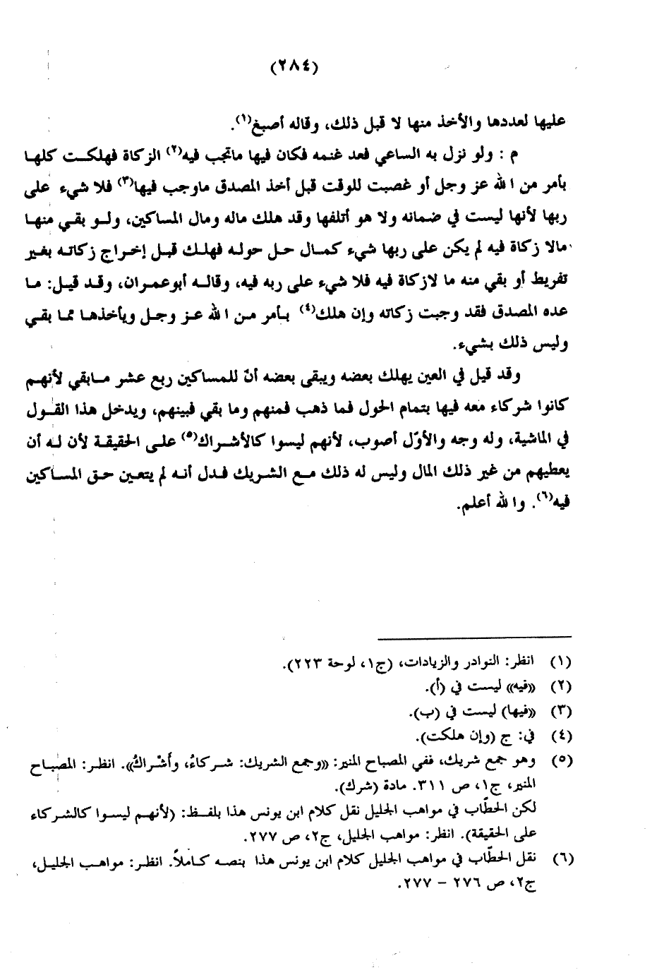 وقد قيل في العين يهلك بعضه ويبقى بعضه أن للمساكين ربع عشر ما بقي لأنهم كانوا شركاء معه فيها بتمام الحول فما ذهب فمنهم وما بقي فبينهم، ويدخل هذا القول في الماشية، وله وجه الأول أصوب، لأنهم ليسوا كالأشراك على الحقيقة لأن له أن يعطيهم من غير ذلك المال وليس له ذلك مع الشريك فدل أنه لم يتعين حق المساكين فيه. والله أعلم.