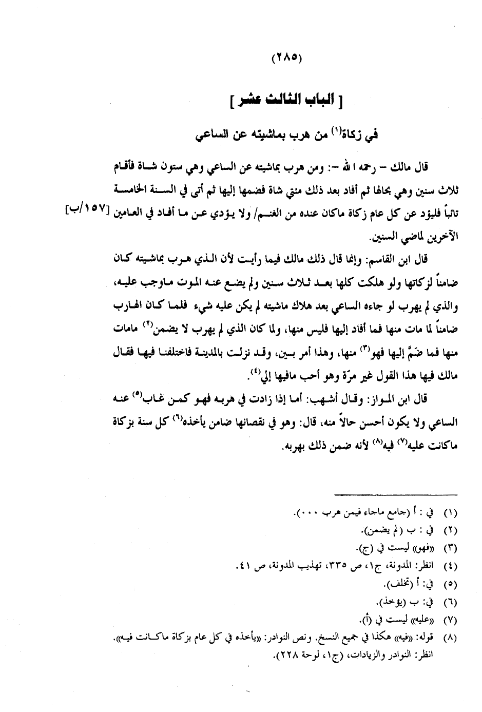 قال ابن القاسم: وإنما قال ذلك مالك فيما رأيت لأن الذي هرب بماشيته كان ضامنًا لزكاتها ولو هلكت كلها بعد ثلاث سنين ولم يضع عنه الموت ما وجب عليه، والذي لم يهرب لو جاءه الساعي بعد هلاك ماشيته لم يكن عليه شيء فلما كان الهارب ضامنًا لما مات منها فما أفاد إليها فليس منها، ولما كان الذي لم يهرب لا يضمن ما مات منها فما ضم إليها فهو منها، وهذا أمر بين، وقد نزلت بالمدينة فاختلفنا فيها فقال مالك فيها هذا القول غير مرة وهو أحب ما فيها إلي.