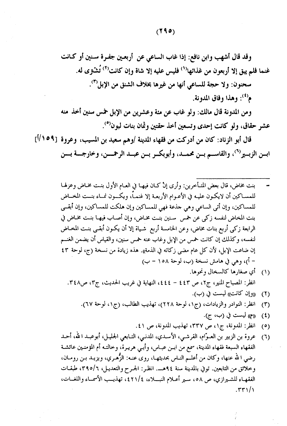 ومن المدونة قال مالك: ولو غاب عن مئة وعشرين من الإبل خمس سنين أخذ منه عشر حقاق، ولو كانت إحدى وتسعين أخذ حقتين وثمان بنات لبون.