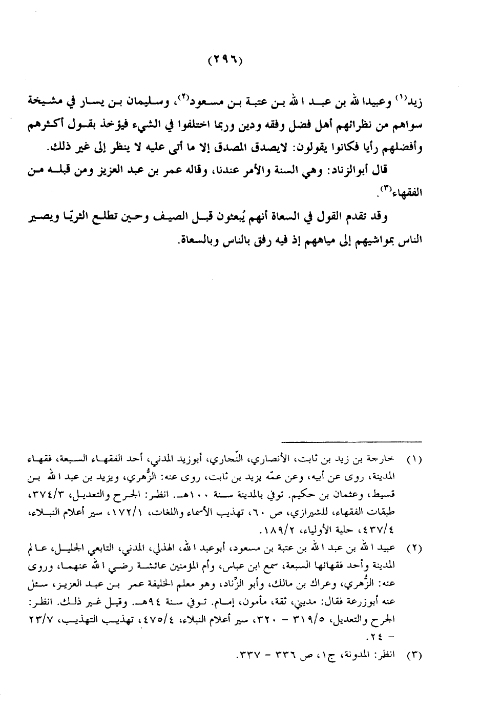 زيد وعبيد الله بن عبد الله بن عتبة بن مسعود، وسليمان بن يسار في مشيخة سواهم من نظرائهم أهل فضل وفقه ودين وربما اختلفوا في الشيء فيؤخذ بقول أكثرهم وأفضلهم رأيا فكانوا يقولون: لا يصدق المصدق إلا ما أتى عليه لا ينظر إلى غير ذلك.