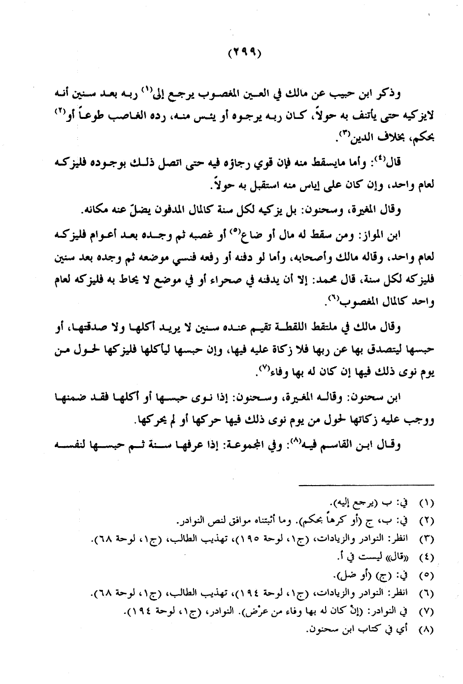 وذكر ابن حبيب عن مالك في العين المغصوب يرجع إلى ربه بعد سنين أنه لا يزكيه حتى يأتنف به حولاً، كان ربه يرجوه أو يئس منه، رده الغاصب طوعًا أو بحكم، بخلاف الدين.