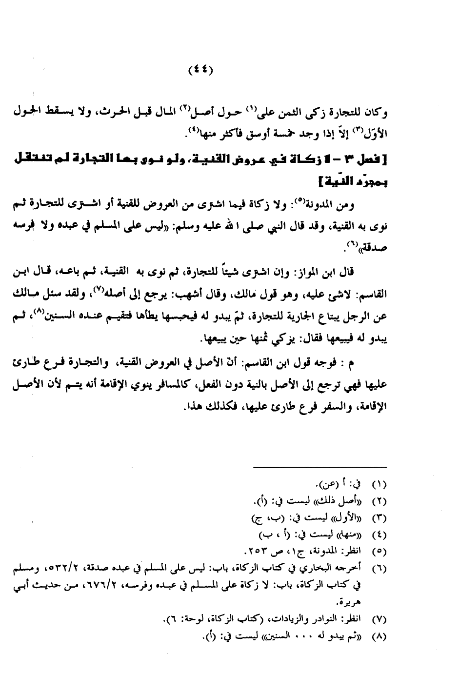 قال ابن المواز: وإن اشترى شيئاً للتجارة، ثم نوى به القنية، ثم باعه، قال ابن القاسم: لا شيء عليه، وهو قول مالك/ وقال أشهب: يرجع إلى أصله، ولقد سئل مالك عن الرجل يبتاع الجارية للتجارة، ثم يبدو لع فيحسبها يطأها فتقين عند السنينن ثم يبدو لع فيبعيها فقال: يزكي ثمنها حين يبيعها.