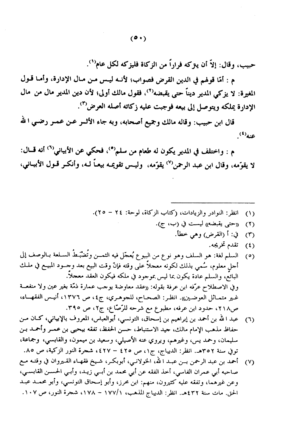 م: أما قولهم في الدين القرض فصواب؛ لأنه ليس من مال الإدارة، وأم قول المغيرة: لا يزكي المدير ديناً حتى يقبضه، فقول مالك أول؛ لأن دين المدير مال من مال الإدارة يملكه ويتوصل إلى بيعه فوجبت عليه زكاته أصله العرض.