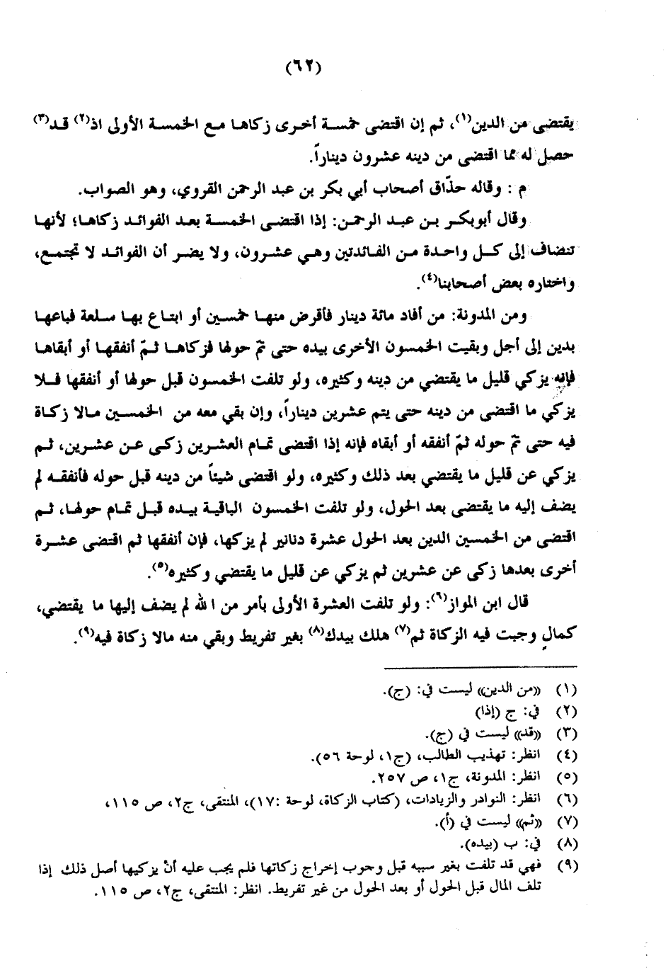 ومن «المدونة»: من أفاد مائة دينار فأقرض منها خمسين أو ابتاع بها سلعة فباعها بدين إلى أجل وبقيت الخمسون الأخرى بيده حتى تمَّ حولها فزكاها ثم أنفقها أو أبقاها فإنه يزكي قليل ما يقتضي من دينه وكثيره، ولو تلفت الخمسون قبل حولها أو أنفقها فلا يزكي ما اقتضى من دينه حتى يتم عشرين دينارًا، وإن بقي معه من الخمسين مالا زكاة فيه حتى تم حوله ثم أنفقه أو أبقاه فإنه إذا اقتضى تمام العشرين زكى عن عشرين، ثم يزكي عن قليل ما يقتضي بعد ذلك وكثيره، ولو اقتضى شيئًا من دينه قبل حوله فأنفقه لم يضف إليه ما يقتضى بعد الحول، ولو تلفت الخمسون الباقية بيده قبل تمام حولها، ثم اقتضى من الخمسين الدين بعد الحول عشرة دنانير لم يزكها، فإن أنفقها ثم اقتضى عشرة أخرى بعدها زكى عن عشرين ثم يزكي عن قليل ما يقتضي وكثيره.