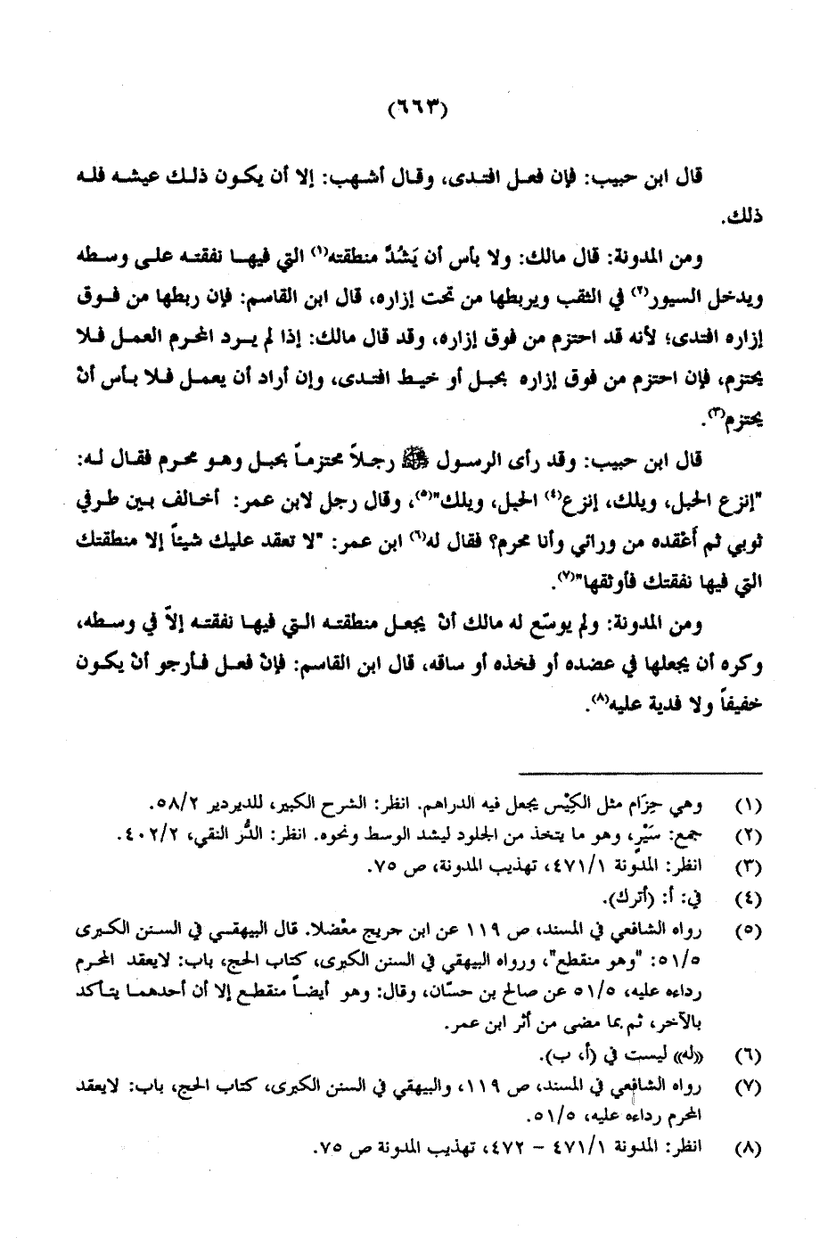 قال ابن حبيب: وقد رأى الرسول صلى الله عليه وسلم رجلا محتزما بحبل وهو محرم فقال له: "انزع الحبل، ويلك، انزع الحبل، ويلك"، وقال رجل لابن عمر: أخالف بين طرفي ثوبي ثم أَعْقده من ورائي وأنا محرم؟ فقال له ابن عمر: "لا تعقد عليك شيئاً إلا منطقتك التي فيها نفقتك فأوثقها.