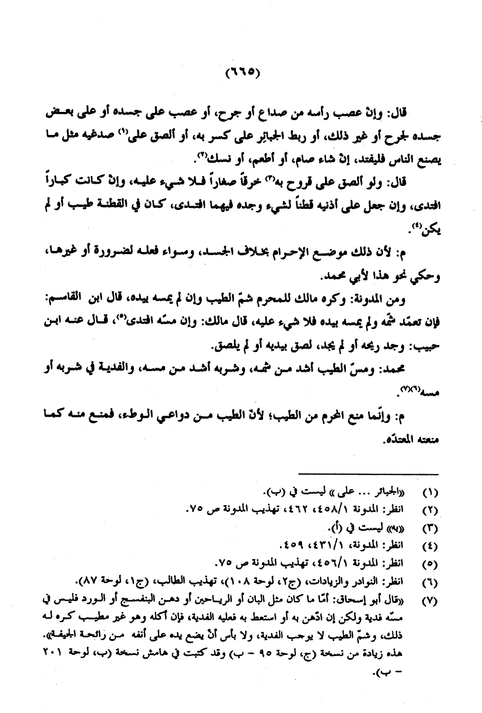 قال: وإن عصب رأسه من صداع أو جرح، أو عصب على جسده أو على بعض جسده لجرح أو غير ذلك، أو ربط الجبائِر على كسر به، أو ألصق على صدغيه مثل ما يصنع الناس فليفقد، إن شاء صام، أو أطعم، أو نسك.