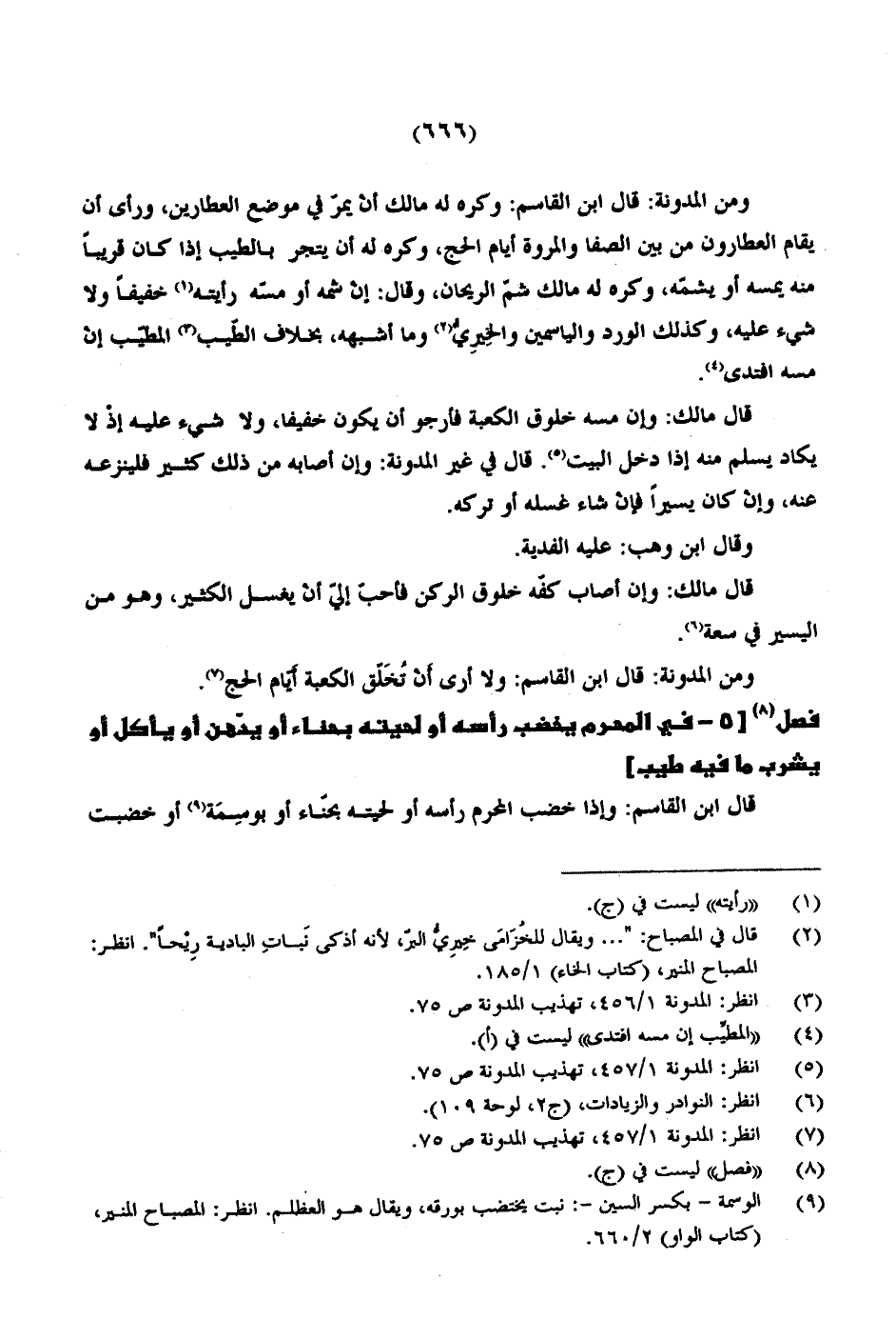 ومن المدونة: قال ابن القاسم: وكره له مالك أن يمرّ في موضع العطارين، ورأى أن يقام العطارون من بين الصفا والمروة أيام الحج، وكره له أن يتجر بالطيب إذا كان قريباً منه يمسه أو يشمّه، وكره له مالك شمّ الريحان، وقال: إن شمه أو مسّه رأيته خفيفاً ولا شيء عليه، وكذلك الورد والياسمين والخِيرِيُّ وما أشبهه، بخلاف الطيب المطّيب إن مسه افتدى.