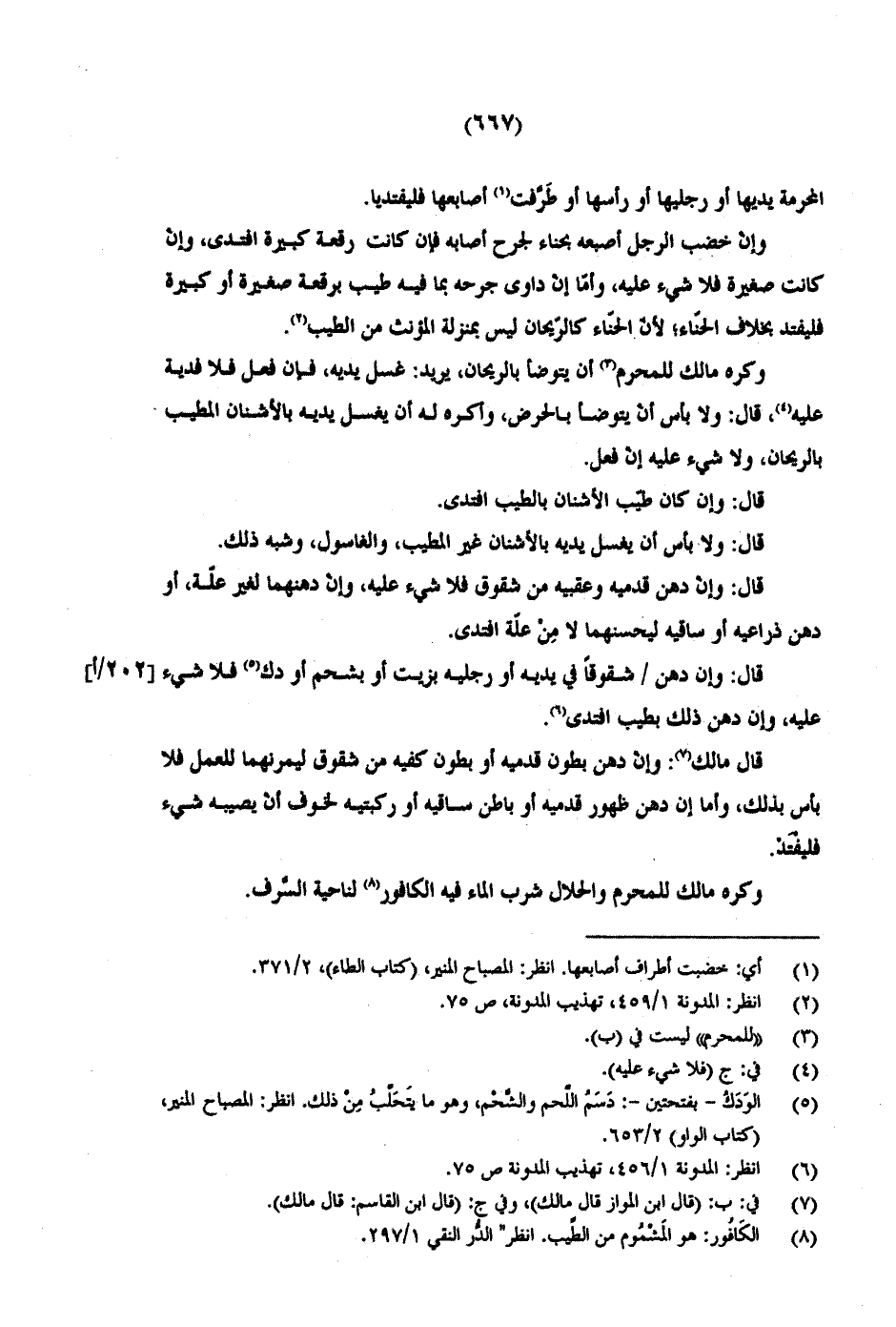 قال مالك: وإن دهن بطون قدميه أو بطون كفيه من شقوق ليمرنهما للعمل فلا بأس بذلك، وأما إن دهن ظهور قدميه أو باطن ساقيه أو ركبتيه لخوف أن يصيبه شيء فلفْتَدْ.