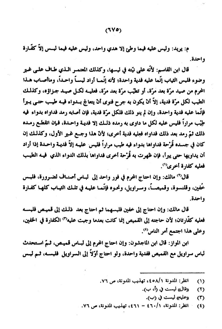 قال ابن القاسم: لأنّه على نّيته في لبسها، وكذلك المعتمر الذي طاف على غير وضوء فلبس الثياب إنّما عليه فدية واحدة؛ لأنه إنّما أراد لبساً واحداً، وما أصاب هذا المحرم من صيد مرّة بعد مرّة، أو تطيّب مرّة بعد مرّة، فعليه لكل صيد جزاؤه، وكذلك الطيب لكل مرّة فدية، إلاّ أن يكون به جرح فتوى أن يتعالج بدواء فيه طيب حتى يبرأ فإنّما عليه فدية واحدة، وإن لم ينو ذلك فلكل مرّة فدية، فإن أصابه رمد فداواه بدواء فيه طِيب مراراً فليس عليه لكل ما داوى به رمده ذلك إلا فدية واحدة، فإن انقطع رمده ذلك ثمّ رمد بعد ذلك فداواه فعليه فدية أخرى؛ لأنّ هذا وجع غير الأول، وكذلك إن كان في جسده قُرْحة فداواها بدواء فيه طيب مراراً فلي عليه إلاّ فدية واحدة إذا أراد أن يدويها حتى يبرأ، فإن ظهرت به قُرْحة أخرى فداواها بذلك الدواء الذي فيه الطيب فعليه كفارة أخرى.