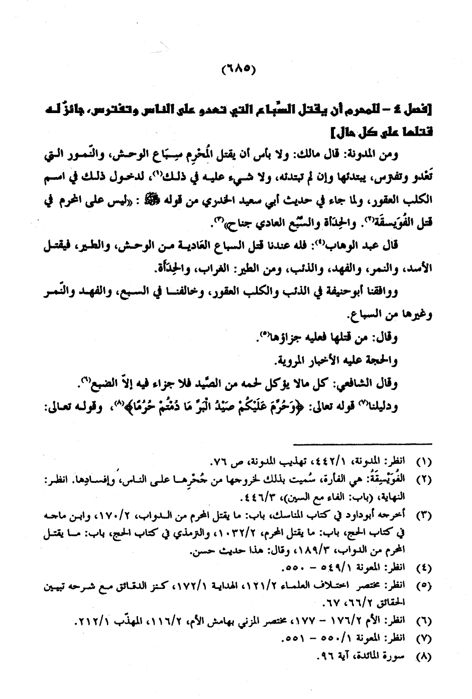 قال عبد الوهاب: فله عندنا قتل السباع العَادية من الوحش، والطير، فيقتل الأسد، والنمر، والفهد، والذئب، ومن الطير: الغراب، والحِدَأَة.