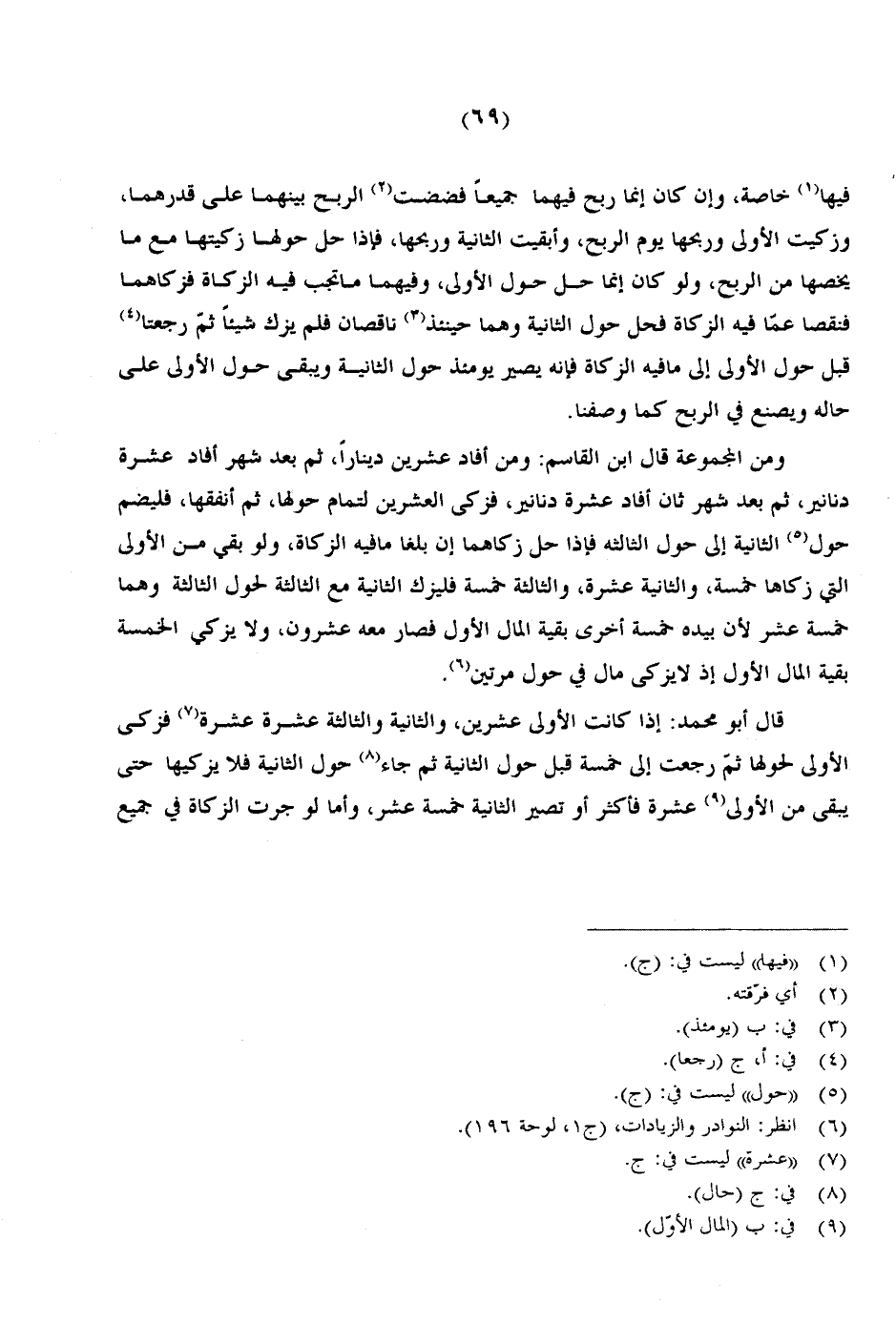 فيها خاصة، وإن كان إنما ربح فيهما جميعًا فضضت الربح بينهما على قدرهما، وزكيت الأولى وربحها يوم الربح، وأبقيت الثانية وربحها، فإذا حل حولها زكيتها مع ما يخصها من الربح، ولو كان إنما حل حول الأولى، وفيهما ما تجب فيه الزكاة فزكاهما فنقصا عما فيه الزكاة فحل حول الثانية وهما حينئذ ناقصان فلم يزك شيئًا ثم رجعتا قبل حول الأولى إلى ما فيه الزكاة فإنه يصير يومئذ حول الثانية ويبقى حول الأولى على حاله ويصنع في الربح كما وصفنا.