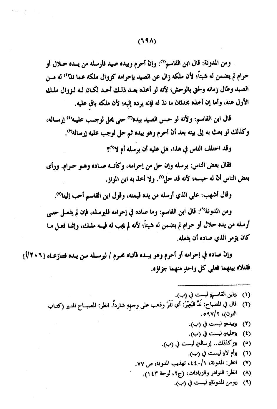 ومن المدونة: قال ابن القاسم: وإن أحرم وبيده صيد فأرسله من يده حلال أو حرام لم يضمن له شيئاً؛ لأن ملكه زال عن الصيد بإحرامه كزوال ملكه عما ندّ له من الصيد وطال زمانه ولحق بالوحش؛ لأنه لو أخذه بعد ذلك أحد لكان له لزوال ملك الأول عنه، وأما إن أخذه بحدثان ما ندّ له فإنه يرده إليه؛ لأن ملكه باقٍ عليه.