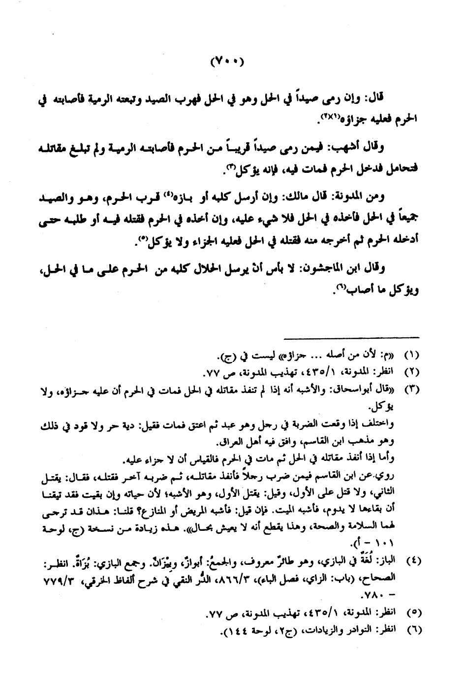 ومن المدونة: قال مالك: وإن أرسل كلبه أو بازه قرب الحرم، وهو والصيد جميعاً في الحل فأخذه في الحل فلا شيء عليه، وإن أخذه في الحرم فقتله فيه أو طلبه حتى أدخله الحرم ثم أخرجه منه فقتله في الحل فعليه الجزاء ولا يؤكل.