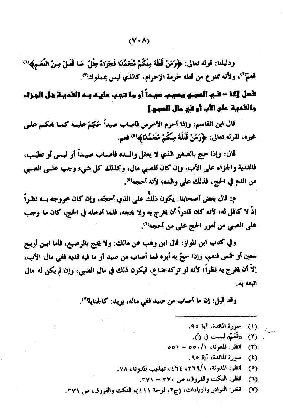 فصل [14 - في الصبي يصيب صيداً سيداً أو ما تجب عليه به الفدية هل الجزاء والفدية على الأب أو في مال الصبي]