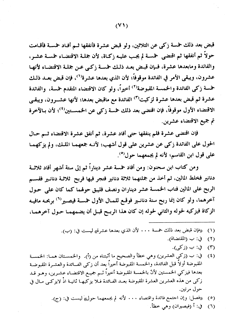 قبض بعد ذلك خمسة زكى عن الثلاثين، ولو قبض عشرة فأنفقها ثم أفاد خمسة فأقامت حولاً ثم أنفقها ثم اقتضى خمسة لم يجب عليه زكاة، لأن جملة الاقتضاء خمسة عشر، والفائدة وما بعدها عشرة، فإن قبض بعد ذلك خمسة زكى عن جملة الاقتضاء لأنها عشرون، ويبقى الأمر في الفائدة موقوفًا؛ لأن الذي بعدها عشرة، فإن قبض بعد ذلك خمسة زكى الفائدة والخمسة المقبوضة أخيرًا، ولو كان الاقتضاء المتقدم خمسة، والفائدة عشرة ثم قبض بعدها عشرة لزكيت الفائدة مع ما قبض بعدها؛ لأنها عشرون، ويبقى الاقتضاء الأول موقوفًا، فإن اقتضى بعد ذلك خمسة زكى عن الخمستين؛ لأن بالآخرة تم جميع الاقتضاء عشرين.