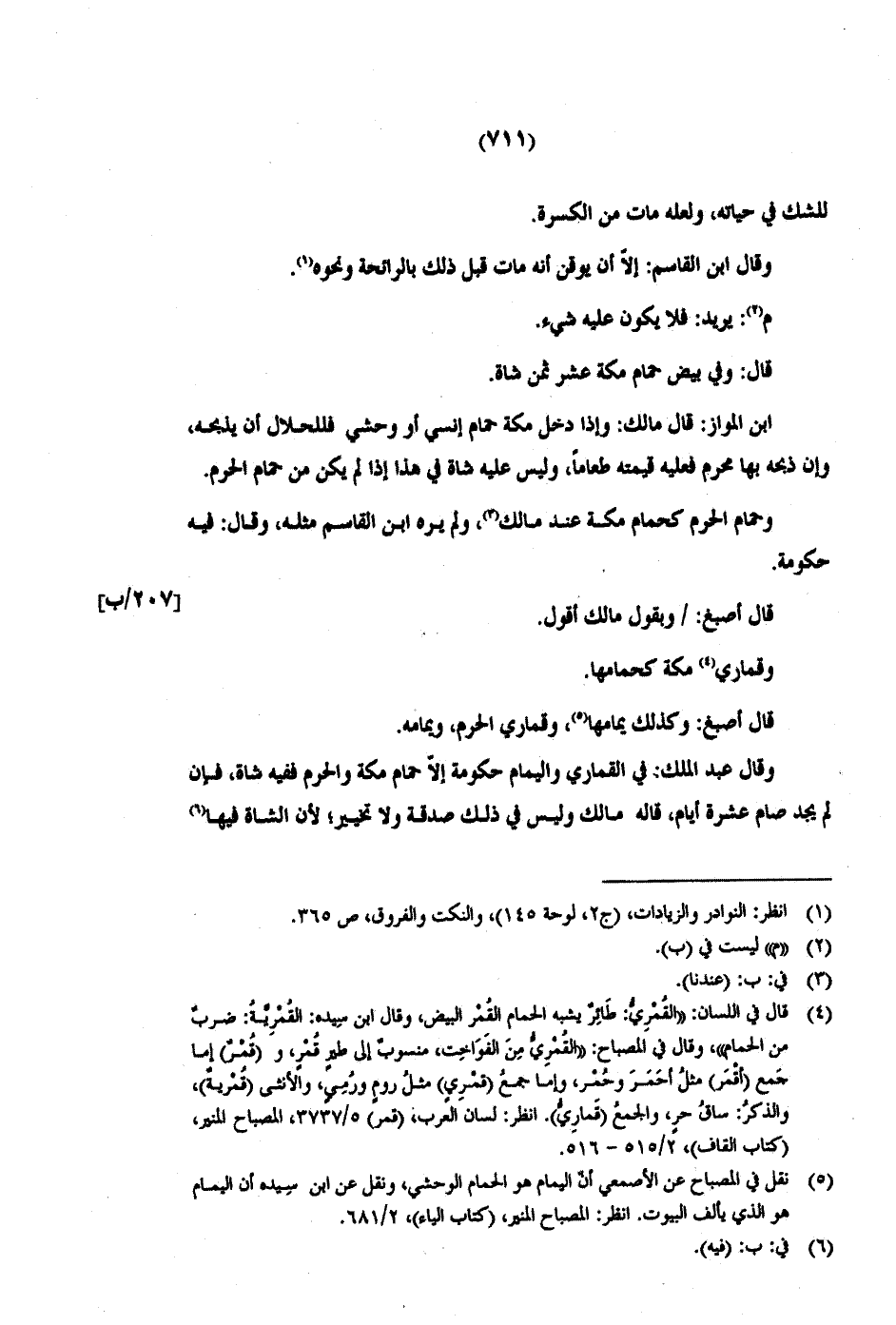 ابن المواز: قال مالك: وإذا دخل مكة حمام إنسي أو وحشي فللحلال أن يذبحه، وإن ذبحه بها محرم فعليه قيمته طعاماً، وليس عليه شاة في هذا إذا لم يكن من حمام الحرم.