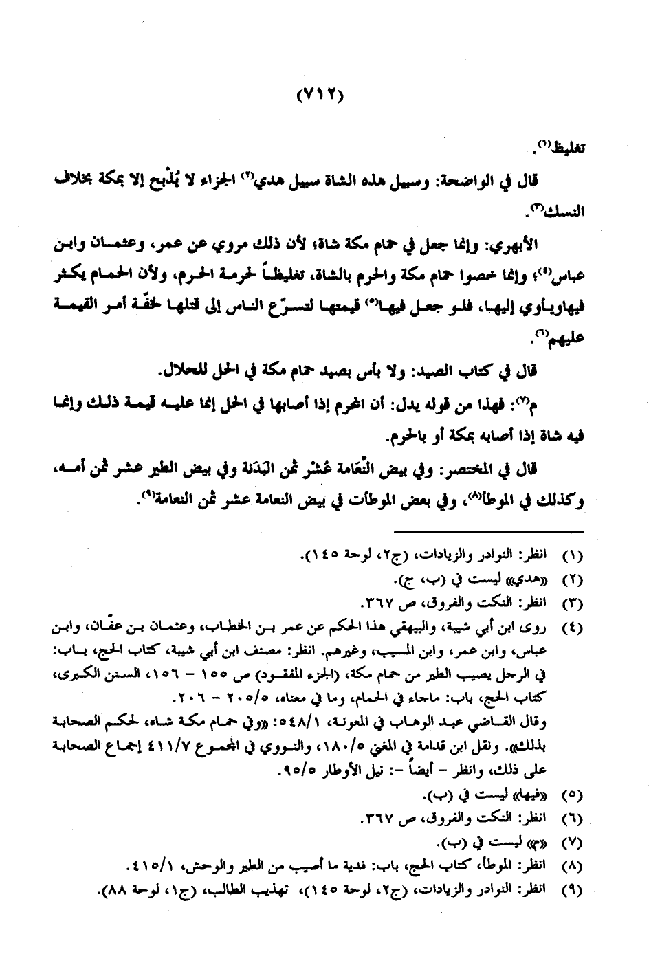 الأبهري: وإنما جعل في حمام مكة شاة؛ لأن ذلك مروي عن عمر، وعثمان وابن عباس؛ وإنما خصوا حمام مكة والحرم بالشاة، تغليظاً لحرمة الحرم، ولأن الحمام يكثر فيها ويأوي إليها، فلو جعل فيها قيمتها لتسرّع الناس إلى قتلها لخفّة أمر القيمة عليهم.