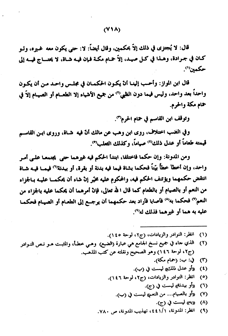 قال ابن المواز: وأحب إلينا أن يكون الحكمان في مجلس واحد من أن يكون واحداً بعد واحد، وليس فيما دون الظبي من جميع الأشياء إلا الطعام أو الصيام إلاّ في حمام مكة والحرم.