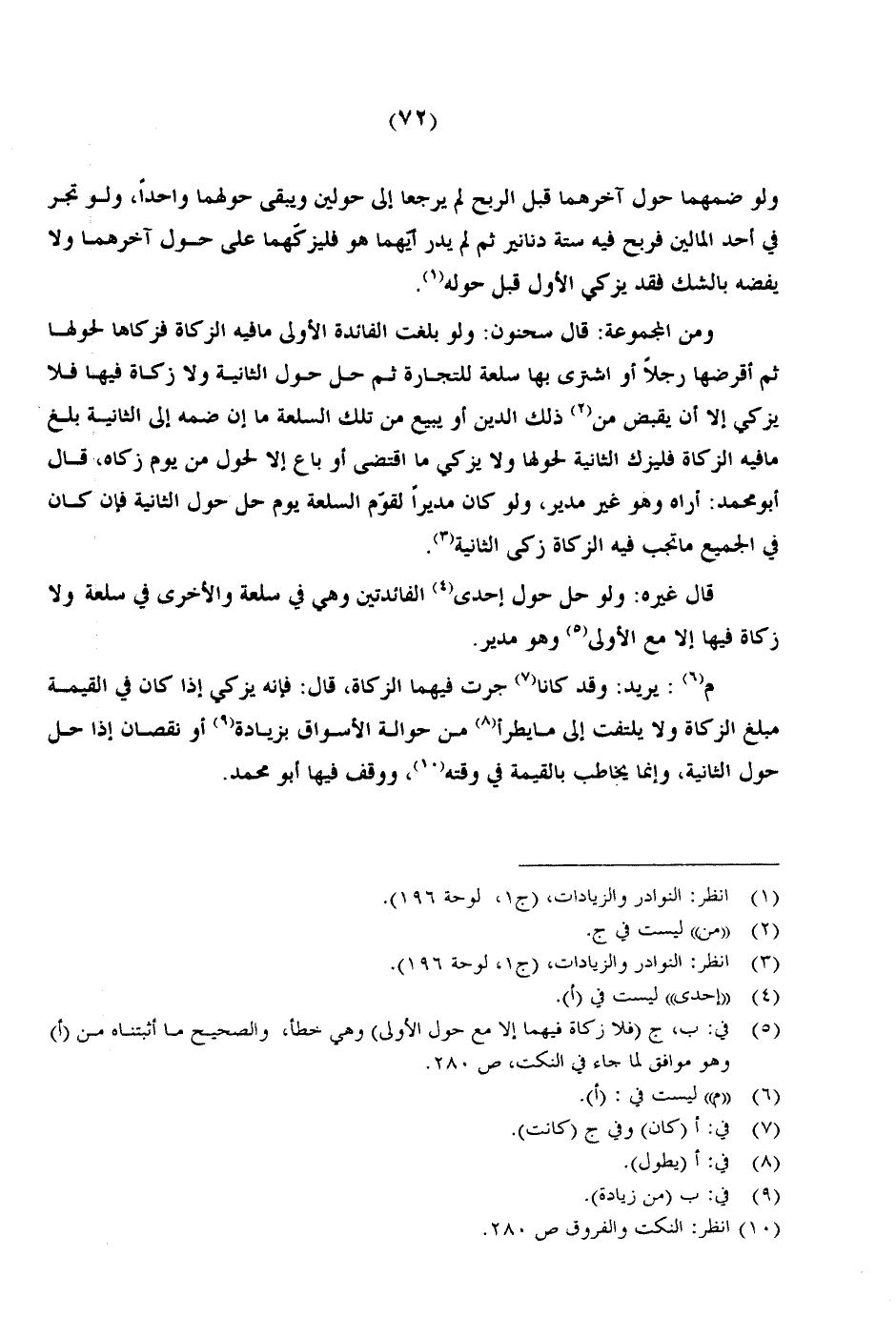 ومن المجموعة: قال سحنون: ولو بلغت الفائدة الأولى ما فيه الزكاة فزكاها لحولها ثم أقرضها رجلاً أو اشترى بها سلعة للتجارة ثم حل حول الثانية ولا زكاة فيها فلا يزكي إلا أن يقبض من ذلك الدين أو يبيع من تلك السلعة ما إن ضمه إلى الثانية بلغ ما فيه الزكاة فليزك الثانية لحولها ولا يزكي ما اقتضى أو باع إلا لحول من يوم زكاه، قال أبو محمد: أراه وهو غير مدير، ولو كان مديرًا لقوم السلعة يوم حل حول الثانية فإن كان في الجميع ما تجب فيه الزكاة زكى الثانية.