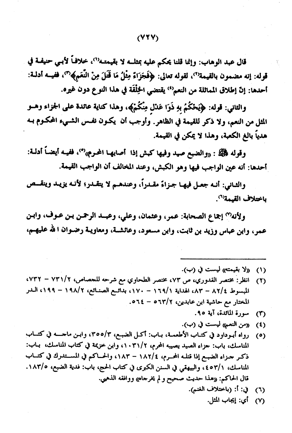 قال عبد الوهاب: وإنما قلنا يحكم عليه بمثله لا بقيمته، خلافًا لأبي حنيفة في قوله: إنه مضمون بالقيمة، لقوله تعالى: {فَجَزَاءٌ مِثْلُ مَا قَتَلَ مِنَ النَّعَمِ}، ففيه أدلة: أحدها: إنّ إطلاق المماثلة من النعم يقتضي الخِلْقَة في هذا النوع دون غيره.