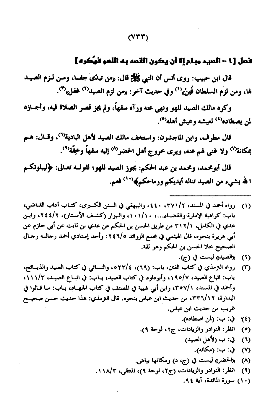 قال ابن حبيب: روى أنس أن النبي صلى الله عليه وسلم قال: «من تبدّى جفا، ومن لزم الصيد لها، ومن لزم السلطان فُتِنْ» في حديث آخر: «من لزم الصيد غفل».