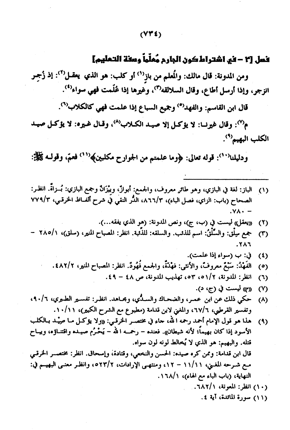 ومن المدونة: قال مالك: والمُعلم من بازٍ أو كلب: هو الذي يعقل: إذا زُجِر انزجر، وإذا أرسل أطاع، وقال السلالقه، وغيرها إذا عُلّمت فهي سواء.