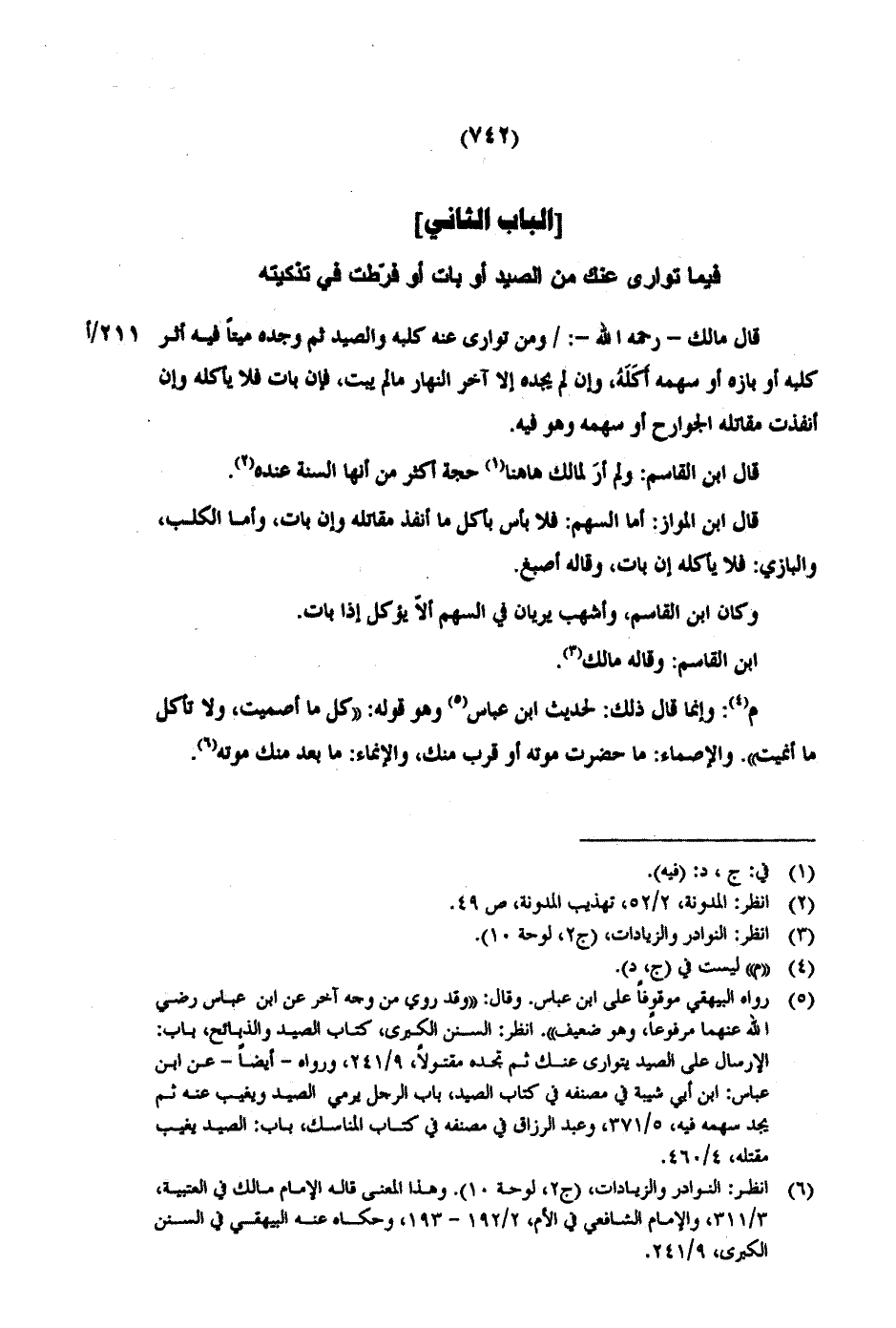 م: وإنما قال ذلك: لحديث ابن عباس وهو قوله: «كل ما أصميت، ولا تأكل ما أنميت». والإصماء: ما حضرت موته أو قرب منك، والإنماء: ما بعد منك موته.